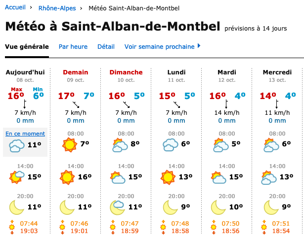 « Quelques grisailles matinales sont encore probables en basses vallées mais le soleil, présent dès le matin en montagne, va vite s’imposer. Quelques nuages isolés l’après-midi sur les hauteurs. Le vent reste plutôt faible de Nord à Nord-est (10 à 40 km/h). Les températures évoluent peu, passant de 6 à 16/18 degrés jusqu’à 1000 m et de 0/2 à 10/12 degrés vers 2000 m (isotherme 0 degré proche de 3500 m). »